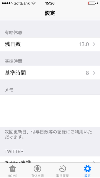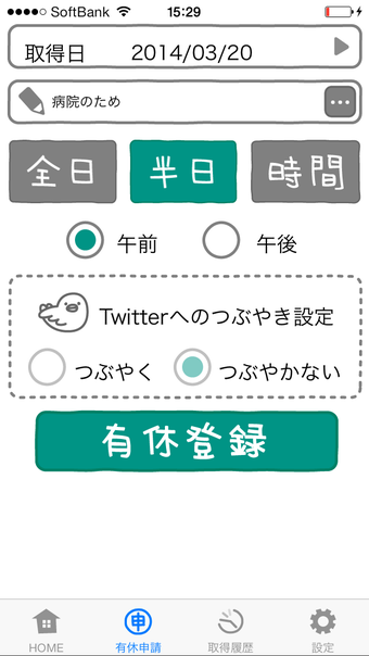 アプリを立ち上げたら、画面下の設定ボタンから現時点での有休残日数と就業の基準時間を設定します。有休を使ったら「有休申請」から取得日や取得理由を記入しましょう。休みは「全日」「半日」「時間」で登録でき、「有休登録」ボタンを押せばすぐ残日数に反映されます。登録の際は同時にツイッターでも投稿でき、他のユーザーがどんな理由で有休をとったのかなど投稿内容も検索できます。