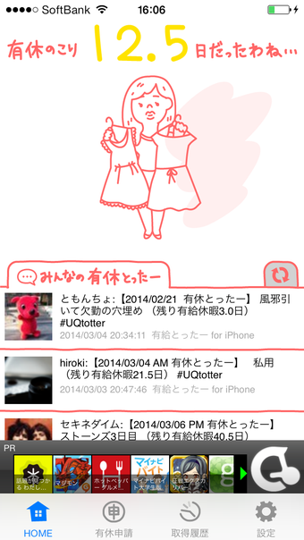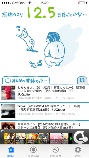 有休とったーは、有休の残日数が分かるアプリです。残日数とともにメイン画面に表示される、ゆるいイラストも好感がもてます。